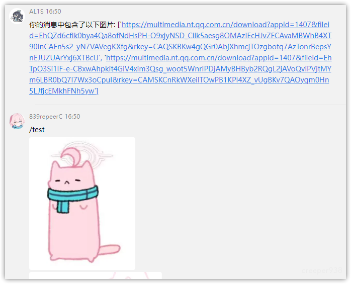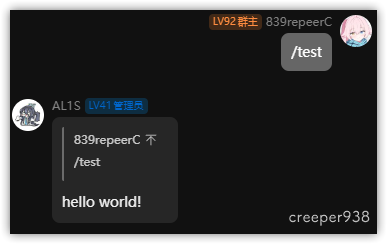 其中,test可以看作是指令的名字,在你向 bot 发送/test之后,这个事件响应器便会触发。对于其他参数的解释,priority表示优先级为 10,block表示这个指令会屏蔽其他低优先级指令