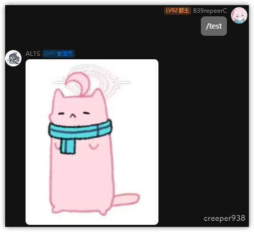 这么写之后,当用户触发了指令,bot 会回复 “你发送了: /test”,如果用户发送的是 “/test 114514” 这种带指令参数的,bot 也能正常回复 “你发送了: /test 114514”